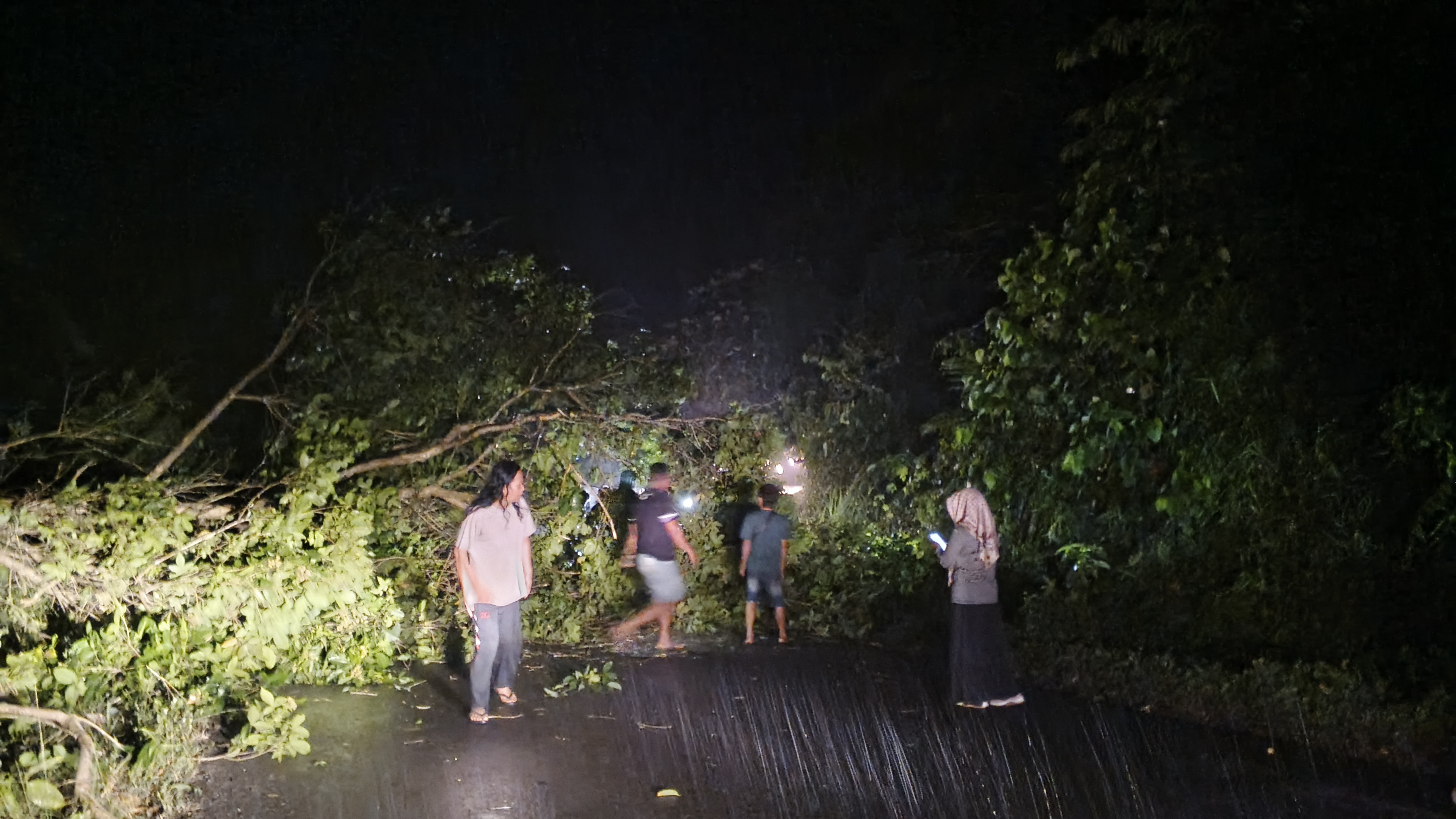 Beginilah penampakan pohon tumbang di jalan lintas Tenang, Arga Makmur–Kota Bengkulu, tepatnya di wilayah Desa Tanung Agung Kecamatan Tanjung Agung Palik, pada malam hari 5 November 2025. -APRIZAL/BE -