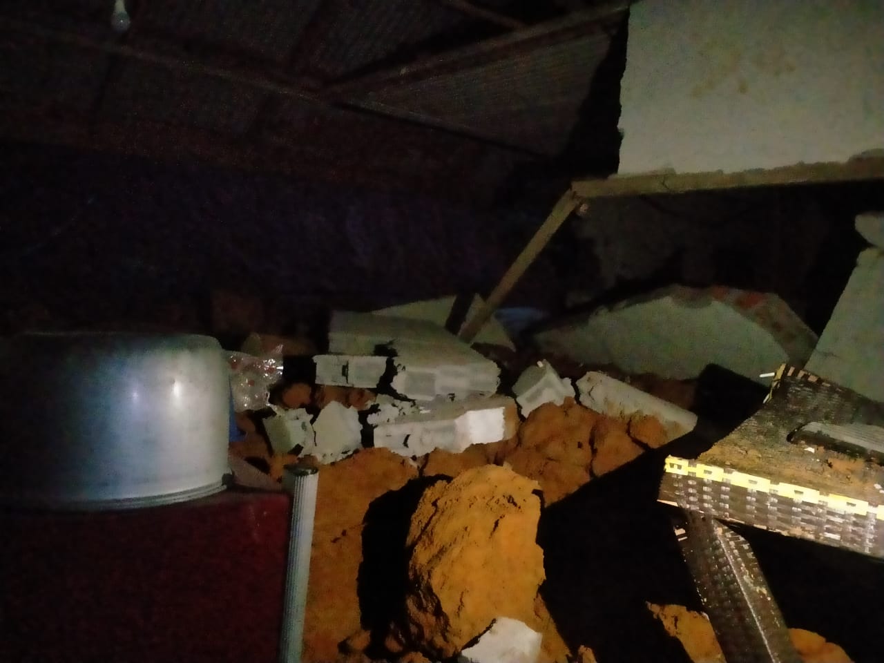 Dinding bagian kanan rumah jebol, bahkan tanah dan batuan ikut masuk ke dalam ruangan.