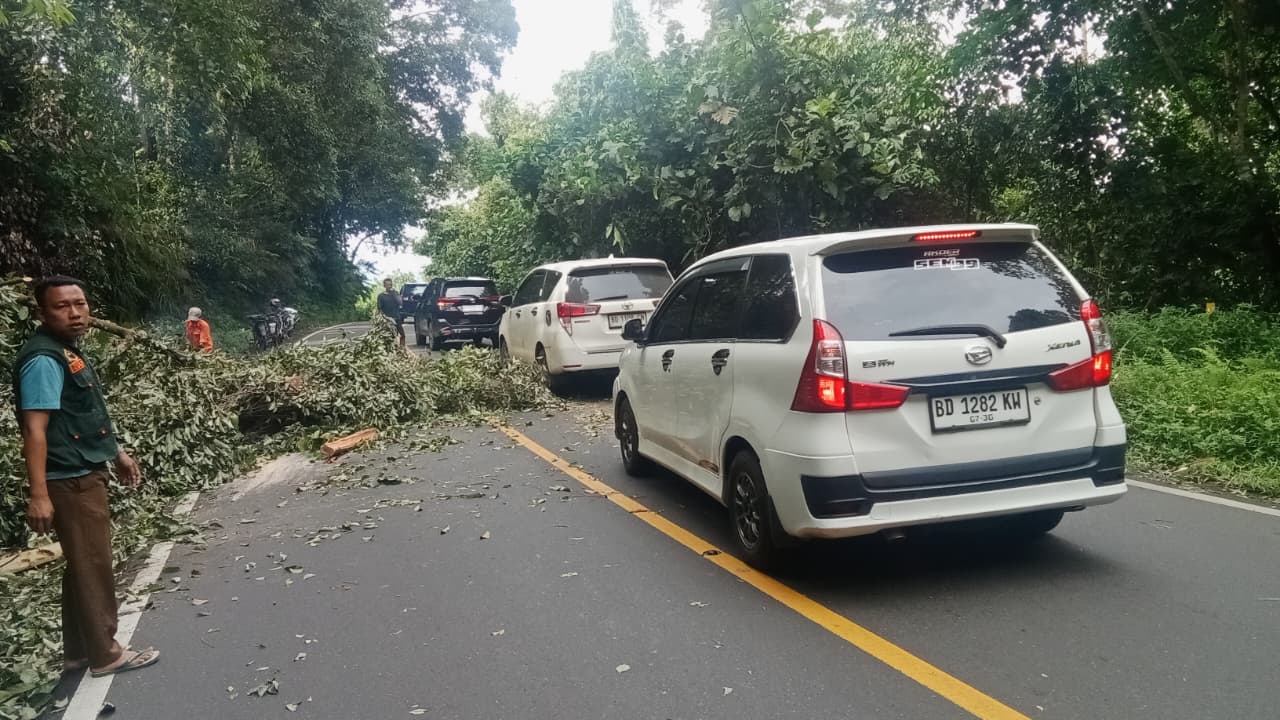 Satu batang pohon berukuran sedang tumbang dan menutup sebagian badan jalan di kawasan liku sembilan KM 43.