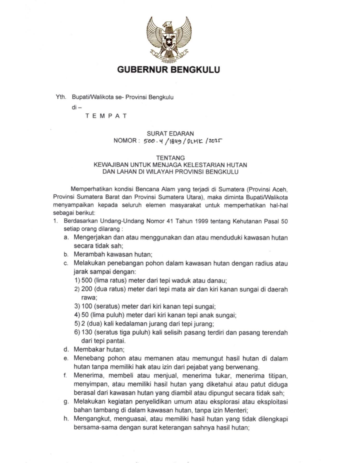 Tembusan surat edaran ini juga disampaikan kepada Presiden RI, Menteri Dalam Negeri, Menteri Kehutanan, Menteri Lingkungan Hidup, Kapolda Bengkulu, Kejati Bengkulu, serta Danrem 041/Gamas Bengkulu.